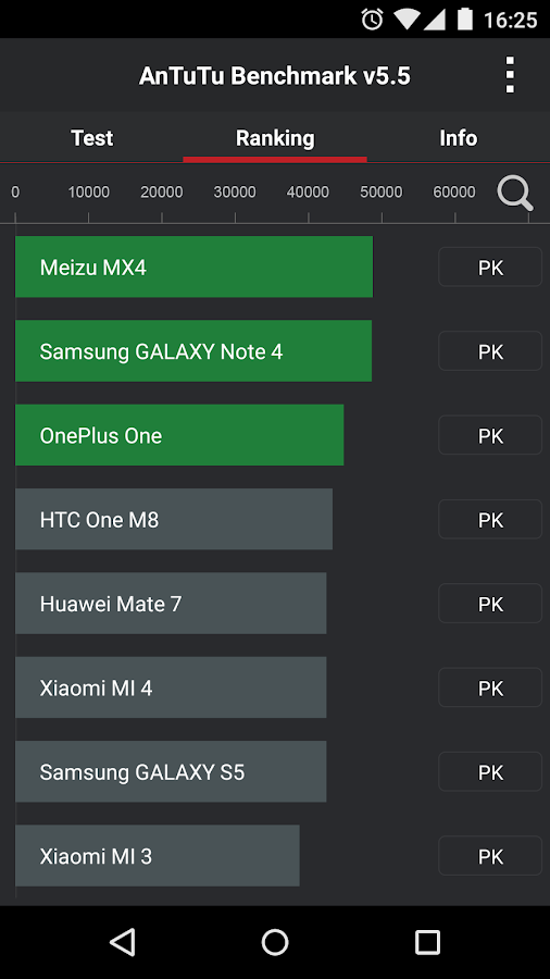 With the Click and Go test suite, Antutu will comprehensively test all aspects of a device, including UX, GPU, RAM, CPU, I/O and more. Each item is individually assessed and given a score. These scores can be uploaded to the Antutu database, and then used to rank your device among all other Android devices.